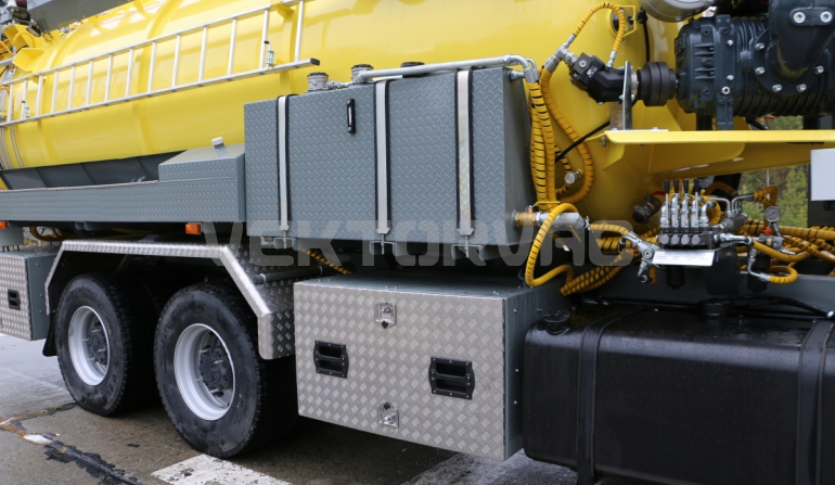 - расширительный гидробак с термометром и уровнемером. Исполнение привода позволяет проводить одновременную работу по гидроразмыву и сбору отходов в номинальных показателях без потери мощности. |