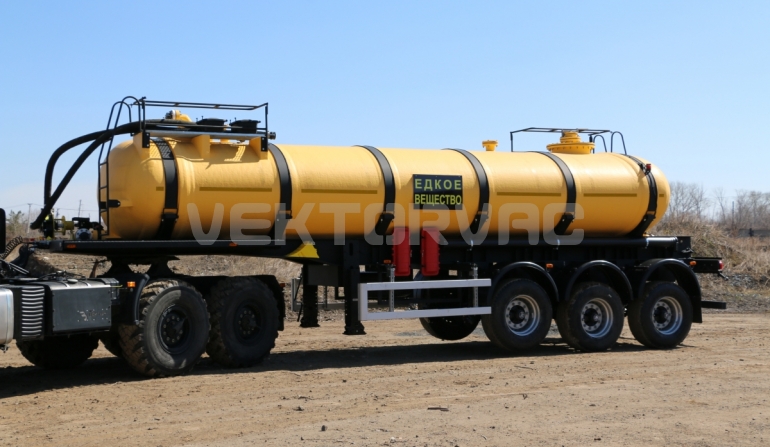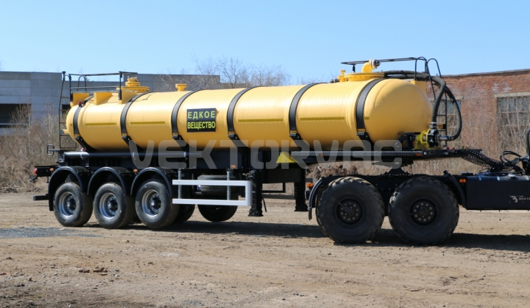 Полуприцеп-цистерна кислотовоз имеет рамную конструкцию – емкость изготовлена из химически стойкого многослойного композиционного материала, усиленного стекловолокном, укладывается в ложементы рамы полуприцепа, рама устанавливается на тележку.